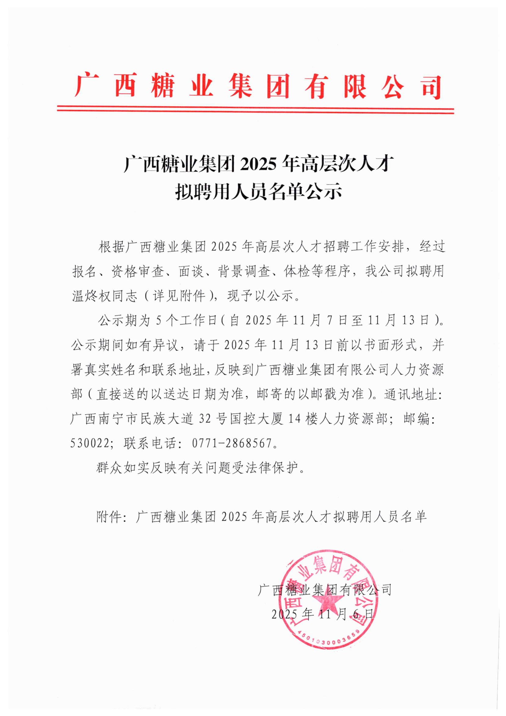 广西糖业集团2025年高层次人才拟聘用人员名单公示