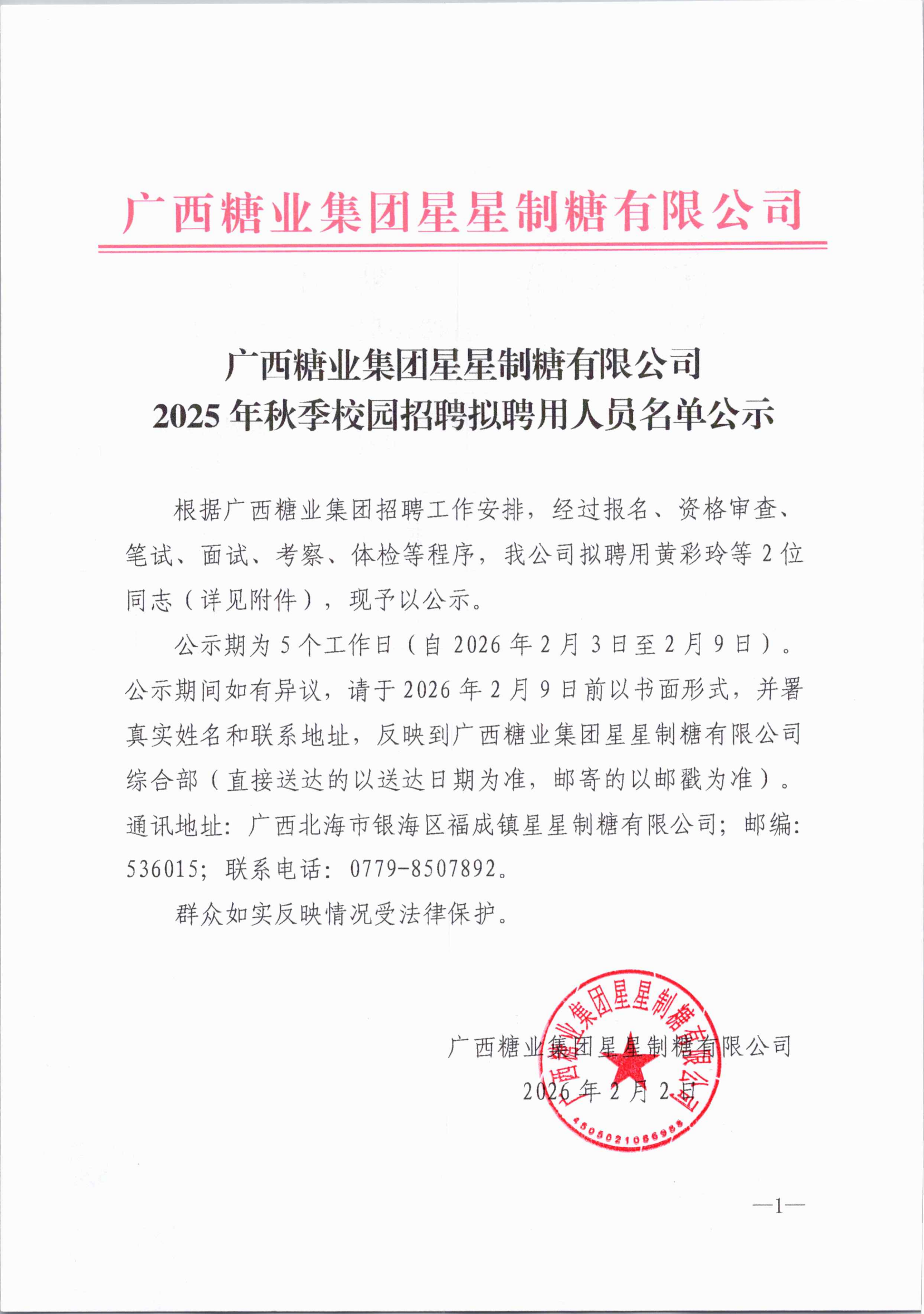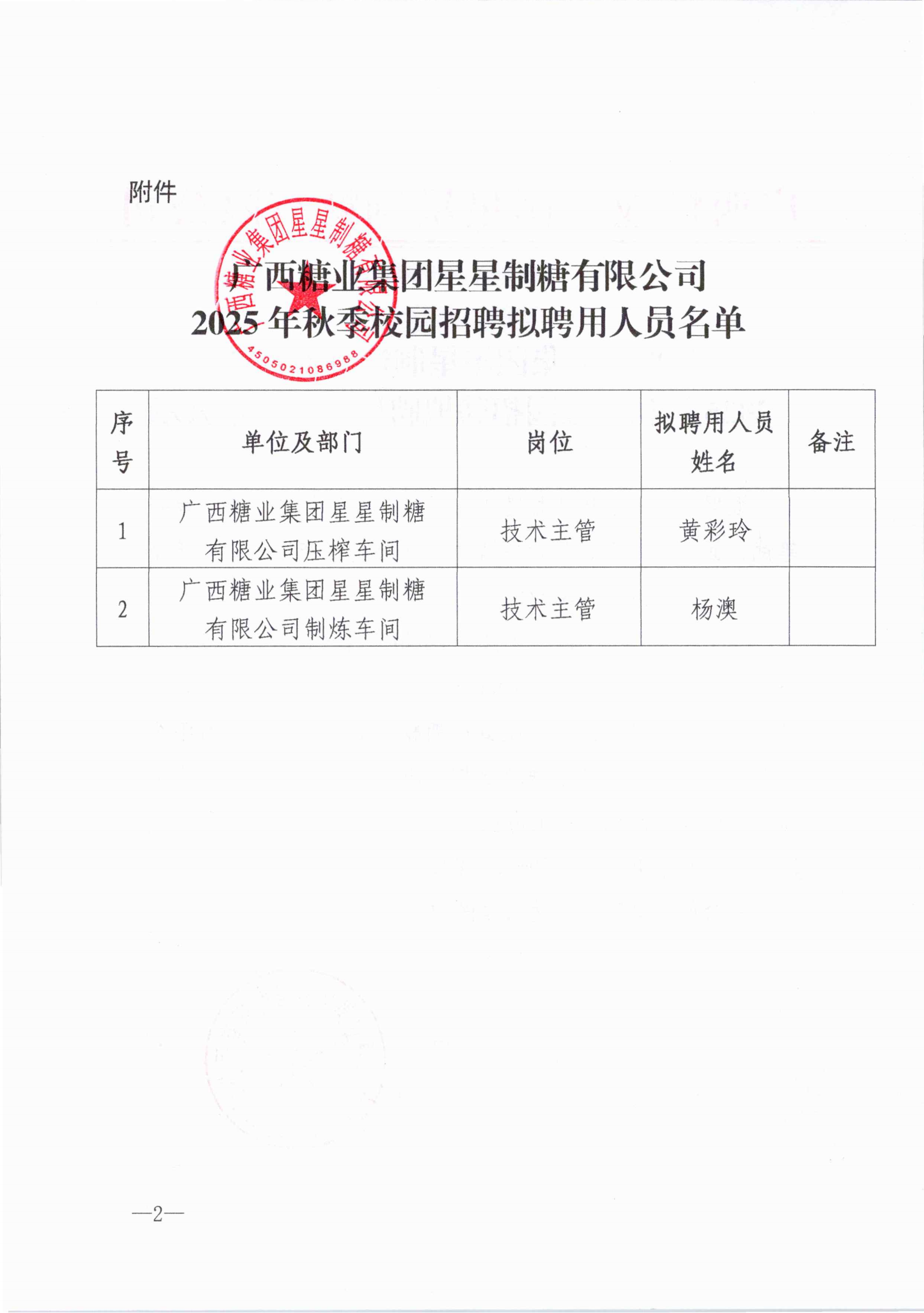 广西糖业集团星星制糖有限公司2025年秋季校园招聘拟聘用人员名单公示