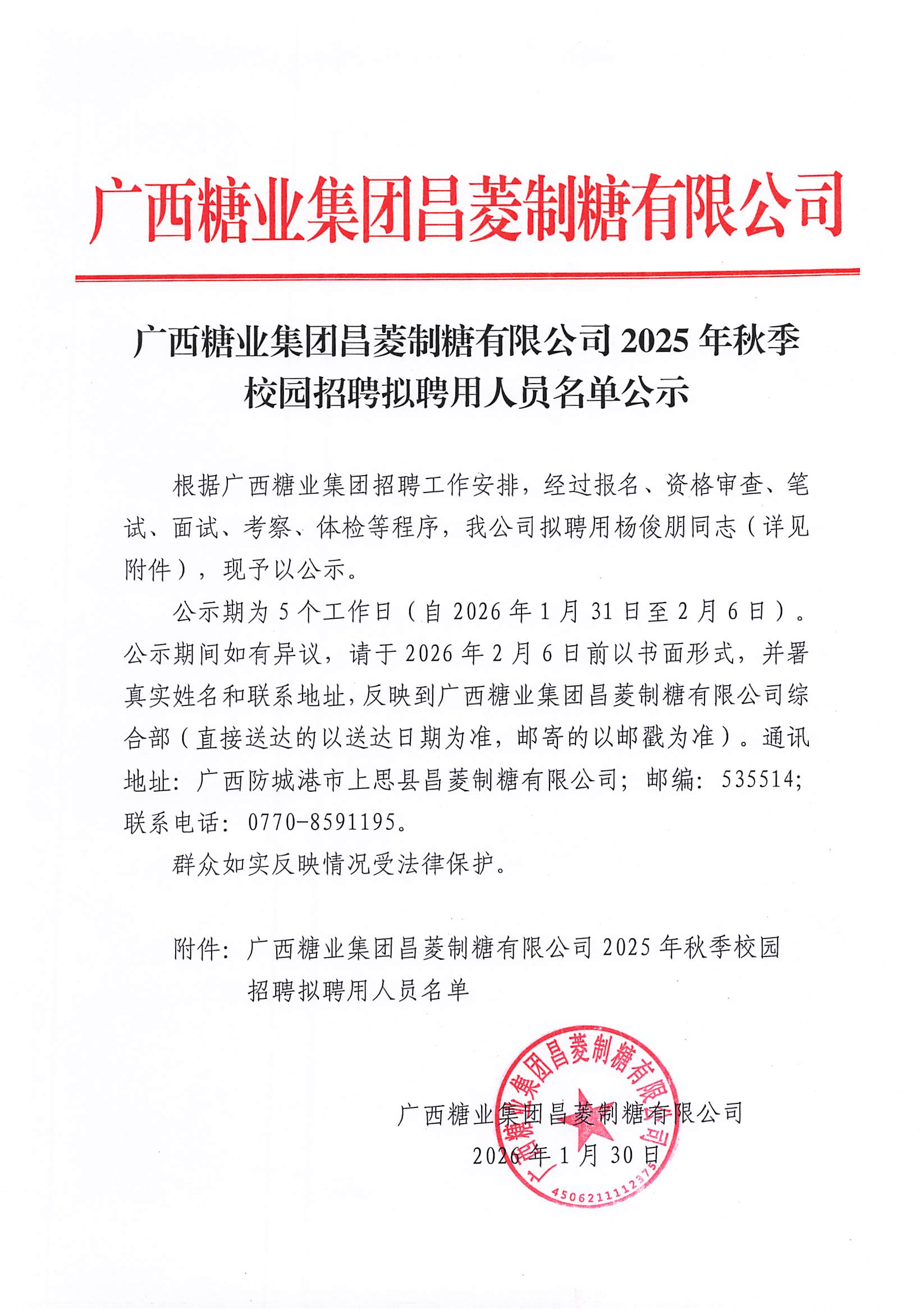 广西糖业集团昌菱制糖有限公司2025年秋季社会招聘拟聘用人员名单公示