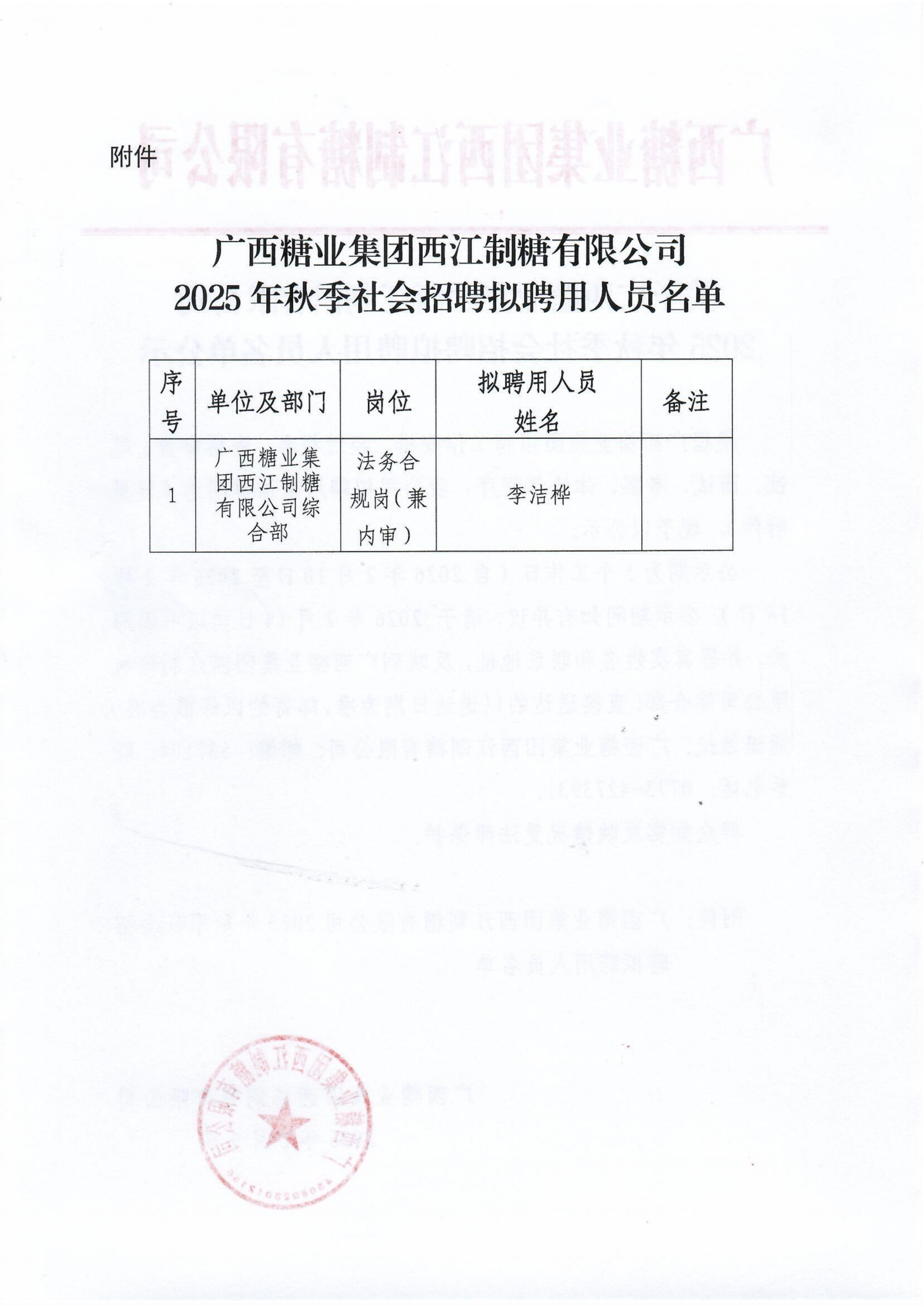关于广西糖业集团西江制糖有限公司2025年秋季社会招聘拟聘用人员名单公示