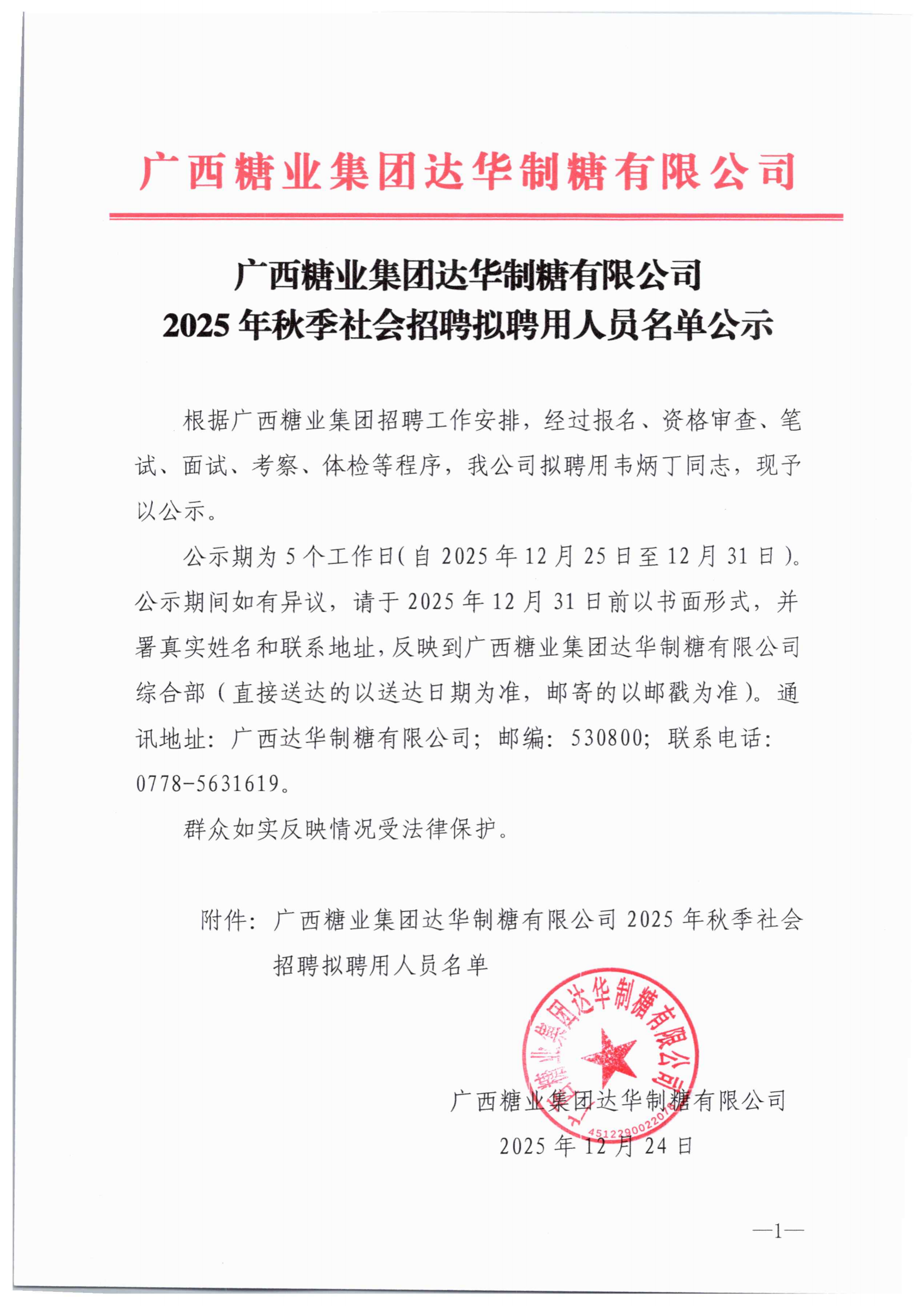 广西糖业集团达华制糖有限公司2025年秋季社会招聘拟聘用人员名单公示