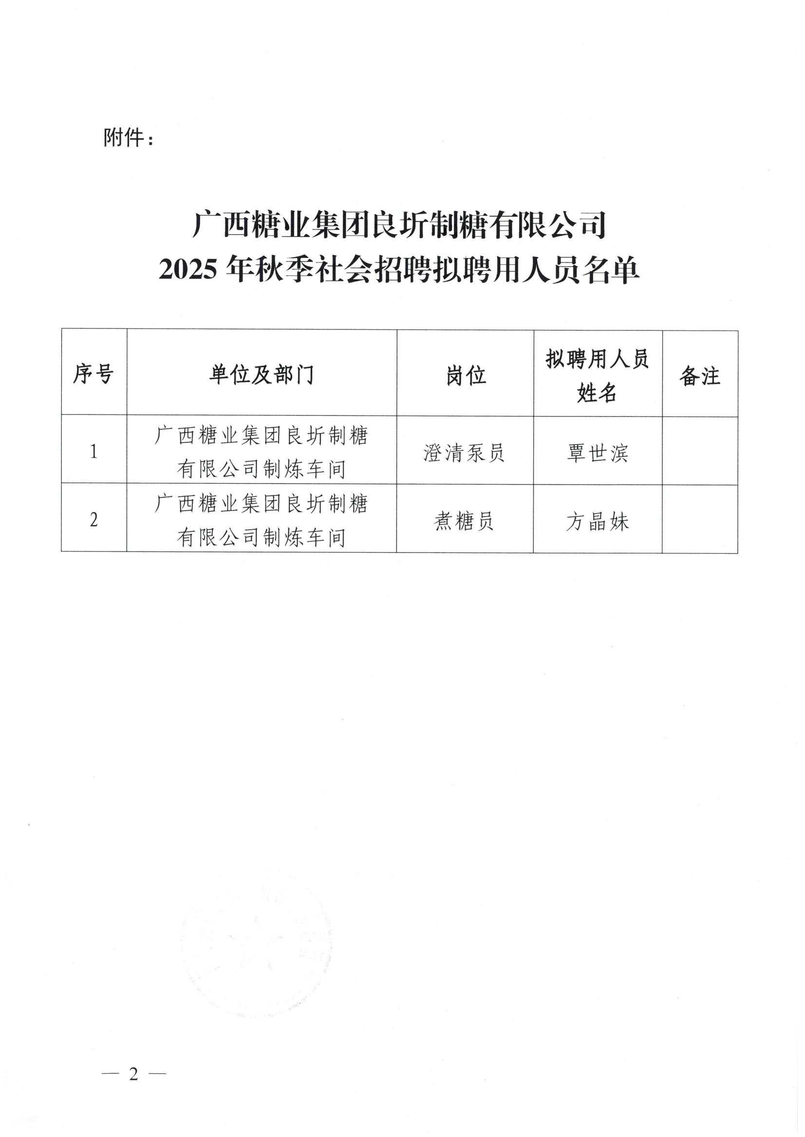 广西糖业集团良圻制糖有限公司2025年秋季社会招聘拟聘用人员名单公示