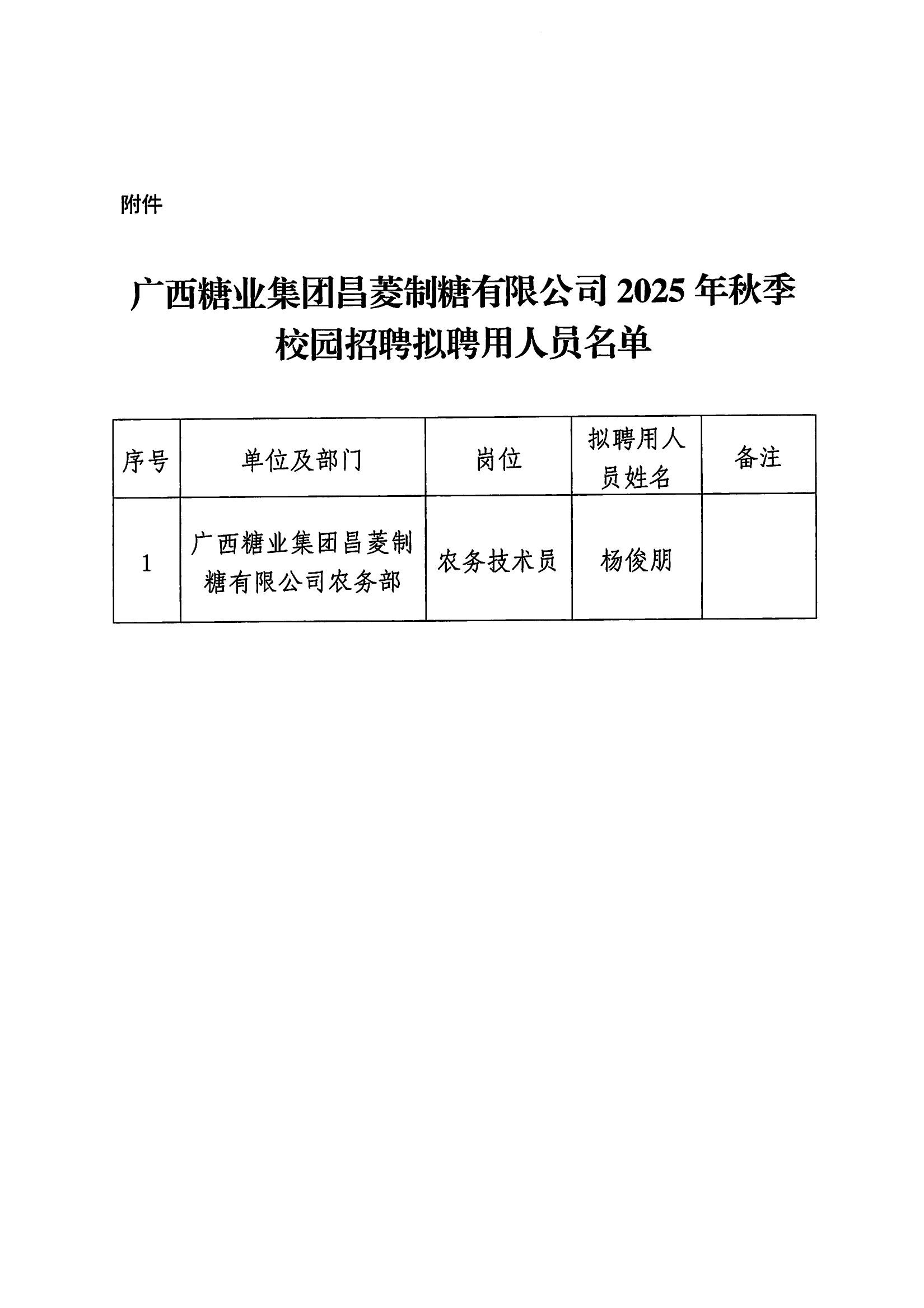 广西糖业集团昌菱制糖有限公司2025年秋季社会招聘拟聘用人员名单公示