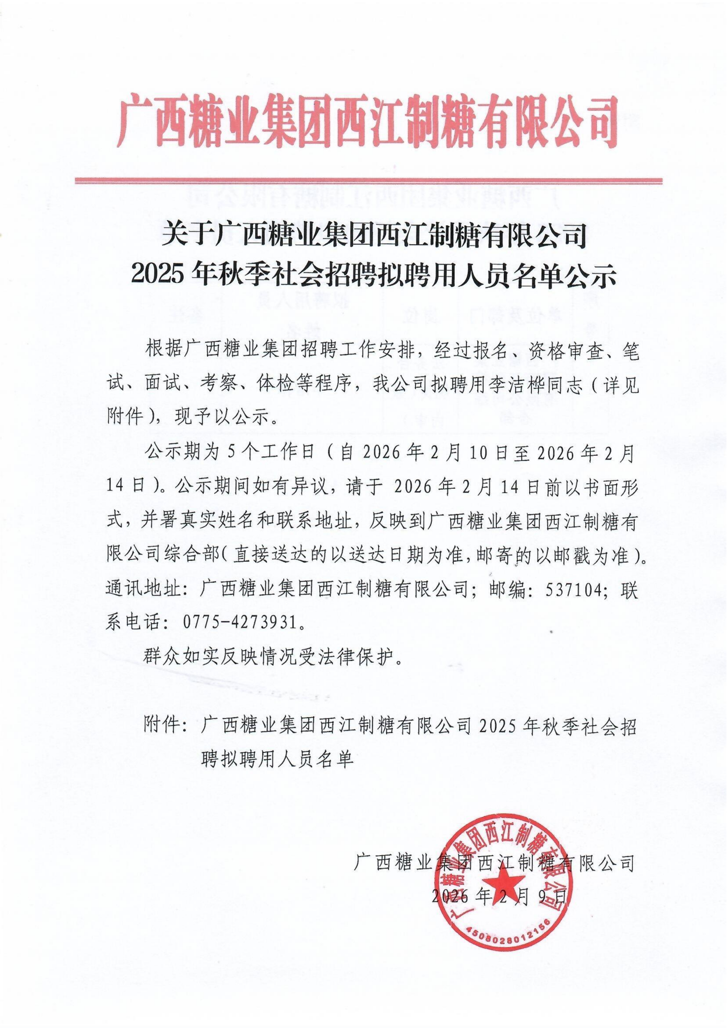 关于广西糖业集团西江制糖有限公司2025年秋季社会招聘拟聘用人员名单公示