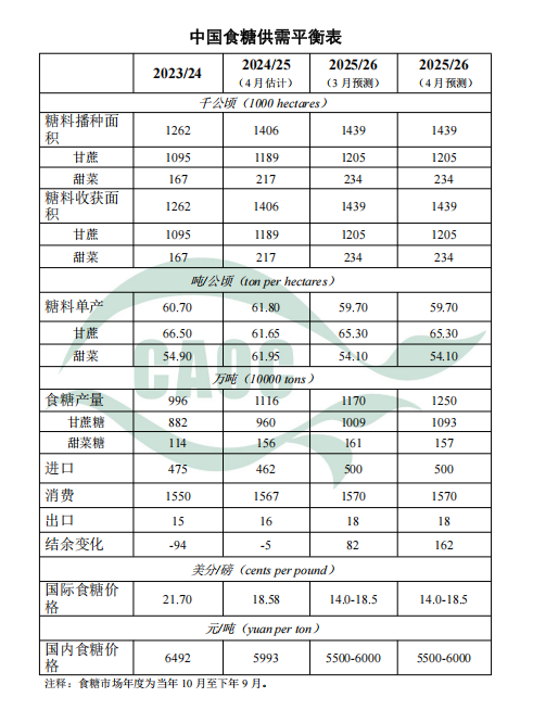 食糖:本月对2024/25年度中国食糖供需平衡表不作调整,将2025/26年度中国食糖产量预测值上调80万吨至1250万吨,主要是广西、云南等主产区甘蔗长势较好,产糖率处于历史较好水平,产糖量高于预期。截至3月底,广西、云南累计产糖分别为740.7万吨、213.4万吨。从生产进度看,北方甜菜糖厂已全部结束生产;南方甘蔗糖主产区广西已进入收榨阶段,云南生产预计持续至5月末。国际方面,2025/26年度巴西、印度、泰国等主产国普遍增产,国际食糖供需仍维持宽松态势。后期需持续关注中东地区局势演变、全球原油市场波动以及巴西2026/27年度甘蔗制糖比变化等因素对国际国内食糖市场的影响。